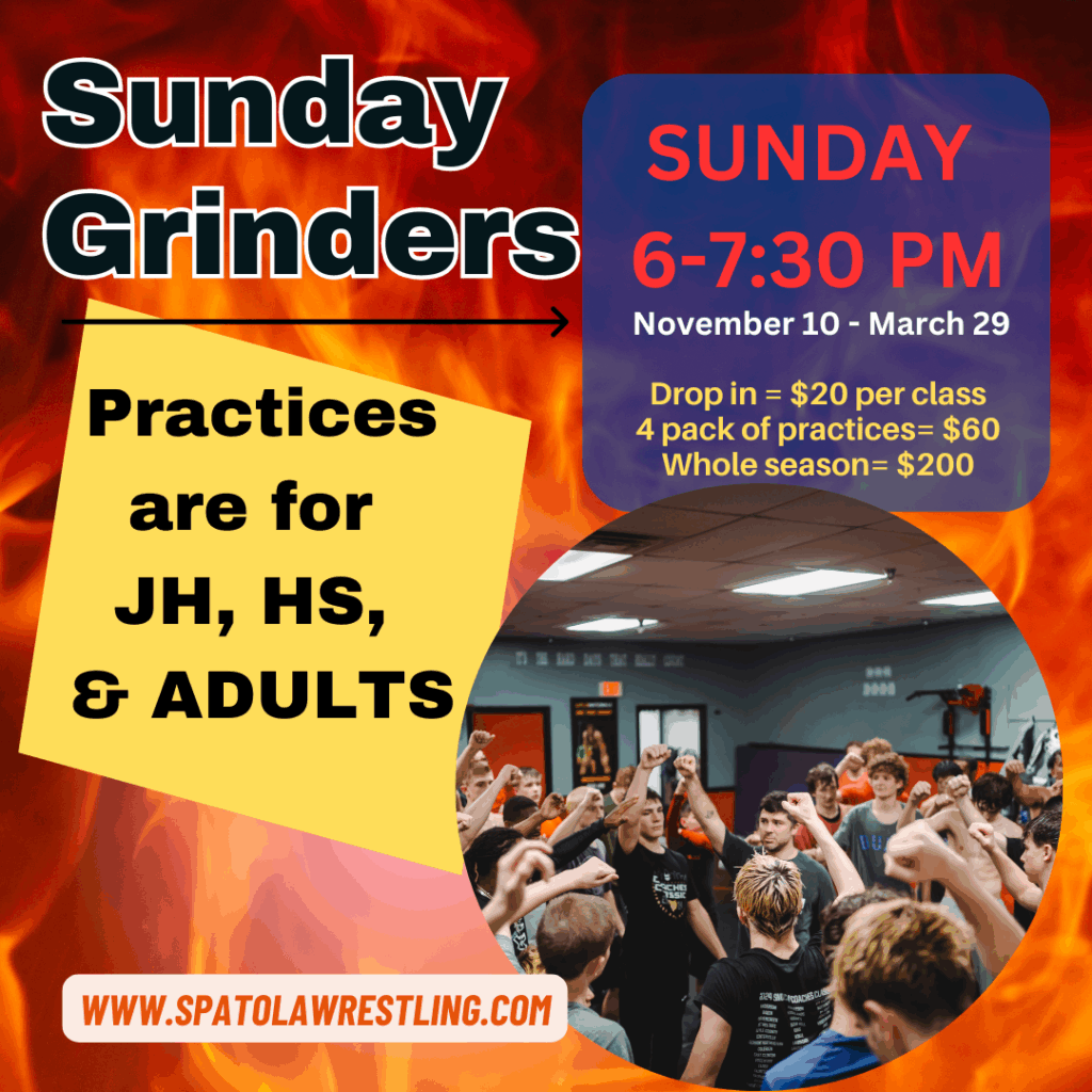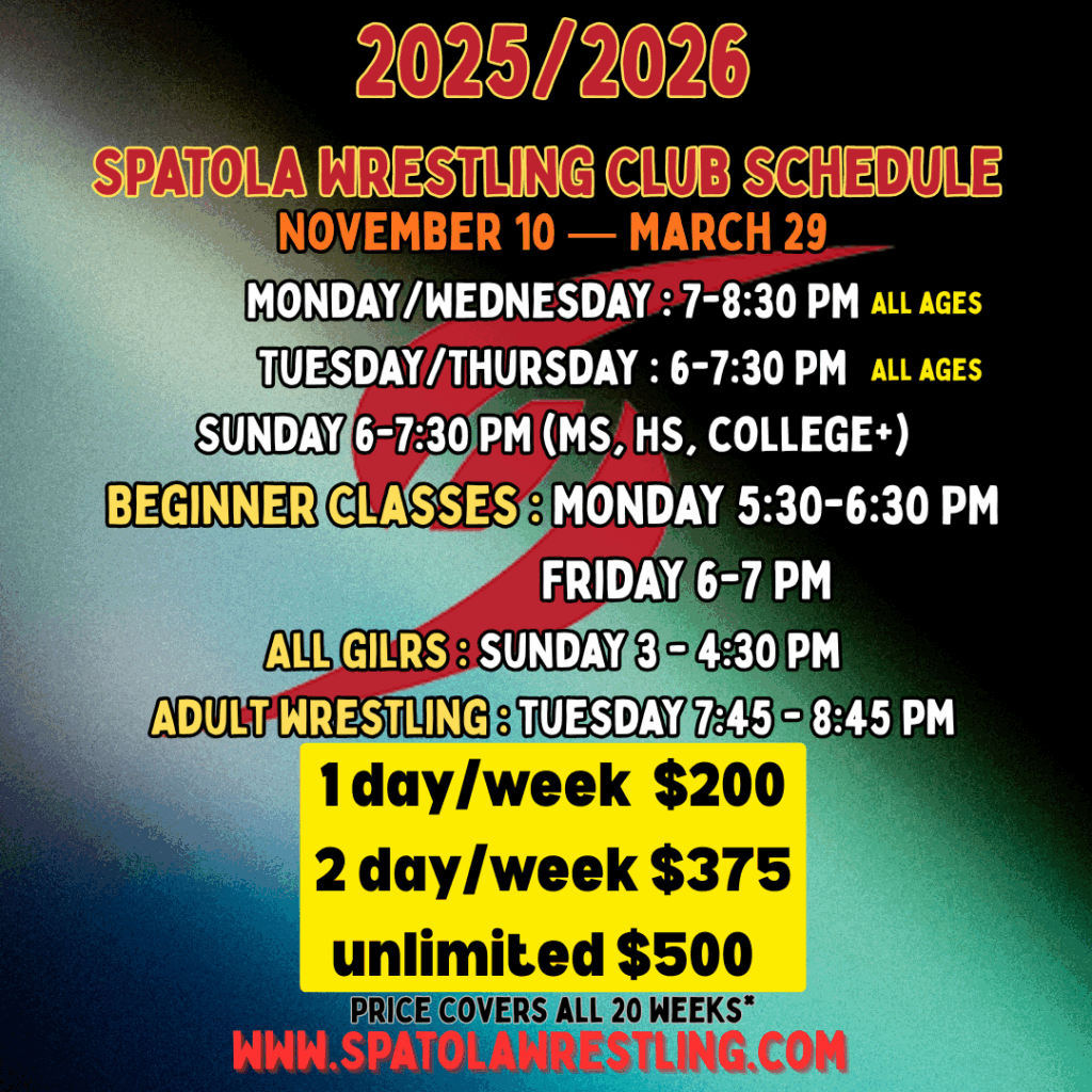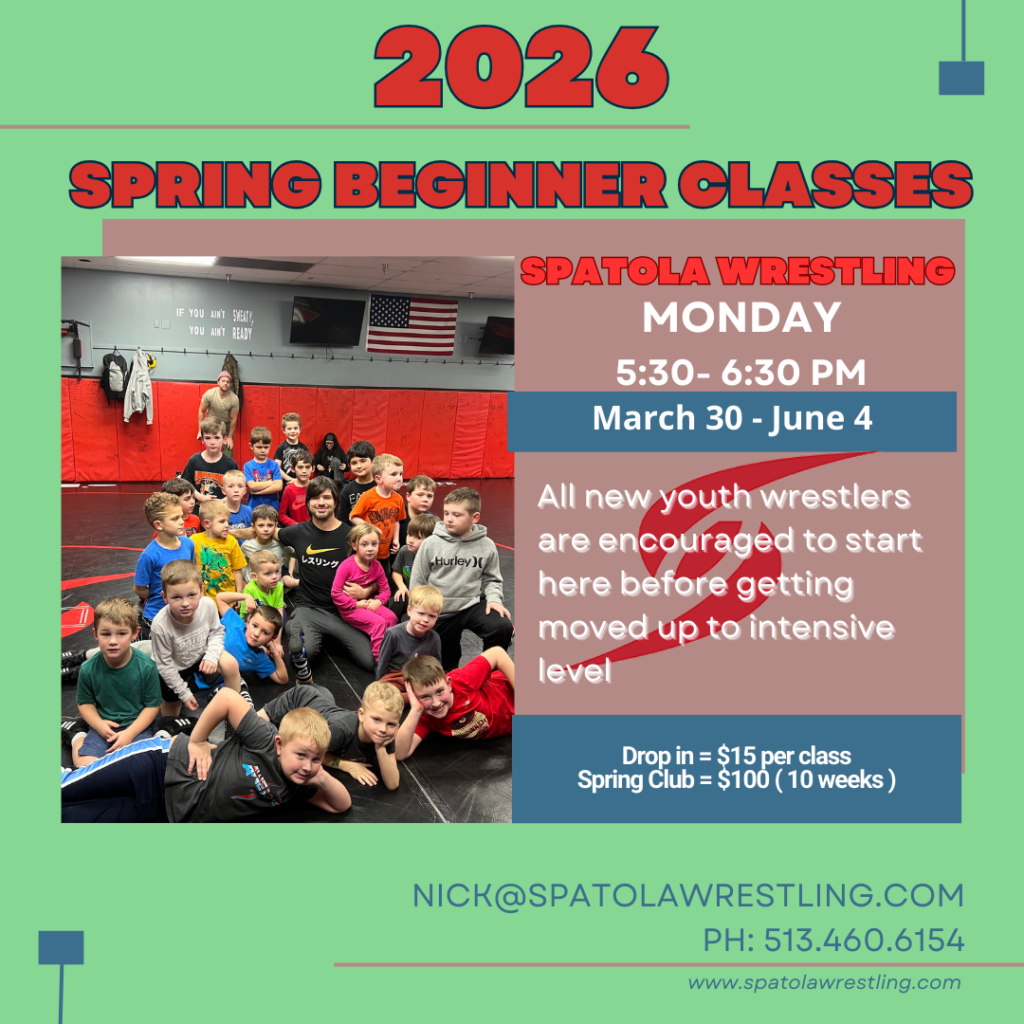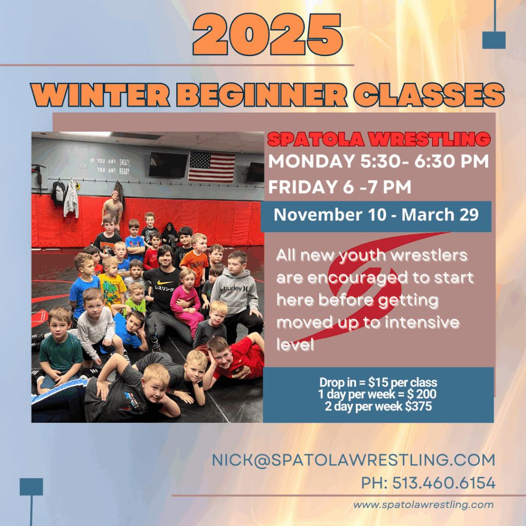 “These structured classes are coach Spatola’s  classic 5 point practices… Warm-up, Drill, Technique, Live Wrestling, Conditioning. You can expect multiple coaches to give all kids individualized instruction, wrestlers from Ohio/Kentucky/Indiana, and a great training atmosphere.”